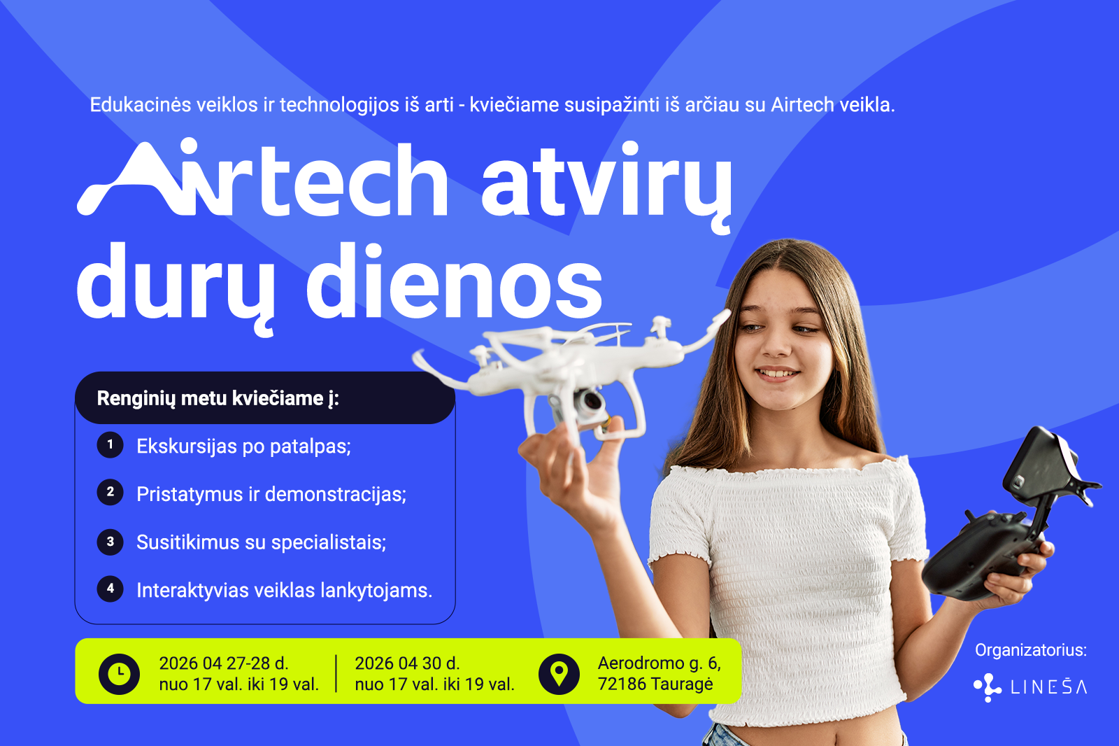 „Džiaugiamės galėdami atverti duris visuomenei ir pasidalinti tuo, ką darome kasdien ir kokia veikla užsiima mūsų dronų pamokas lankantys vaikai“, – sako Kristina Virgayle, Lietuvos neformaliojo švietimo agentūros (LINEŠA) „Airtech“ skyriaus vadovė.